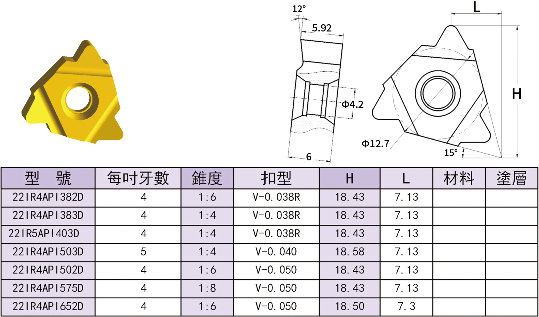 一、影響石油管螺紋加工品質和刀具切削性能的三要素 (A) 刀具本身的外部要素。包含: 刀具結構設計的合理性; 刀片刃面及齒形精度、光潔度及表層組織狀況; 刀片刃口強化品質; 刀桿制造精度及附件如斷屑器等的品質。 (B) 刀片本身的內在要素。主要包含: 刀片基體材料品質與性能; 刀片表面涂層品質與性能; 刀桿材質及熱處理性能。 (C) 刀片的使用要素。主要包...