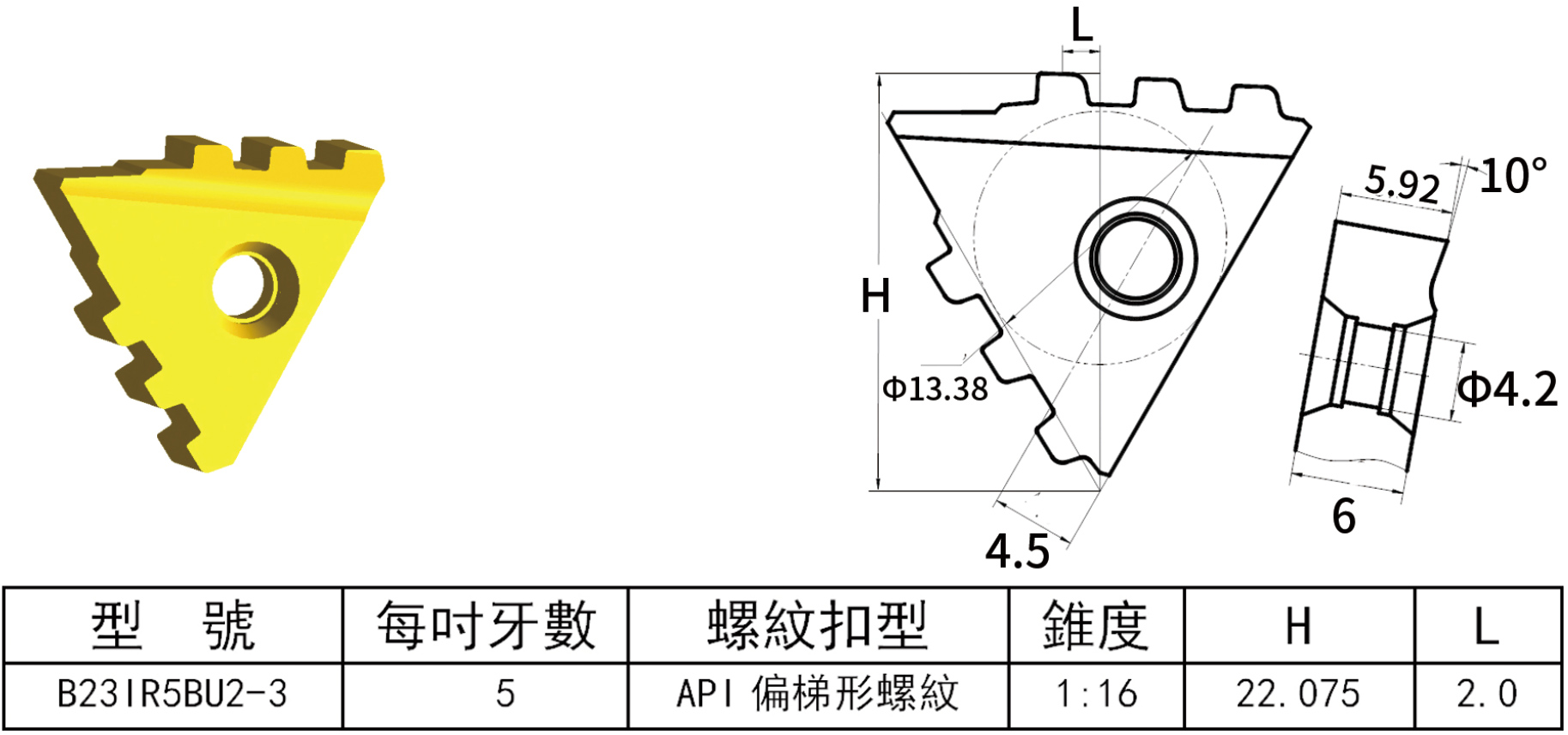一、影響石油管螺紋加工品質和刀具切削性能的三要素 (A) 刀具本身的外部要素。包含: 刀具結構設計的合理性; 刀片刃面及齒形精度、光潔度及表層組織狀況; 刀片刃口強化品質; 刀桿制造精度及附件如斷屑器等的品質。 (B) 刀片本身的內在要素。主要包含: 刀片基體材料品質與性能; 刀片表面涂層品質與性能; 刀桿材質及熱處理性能。 (C) 刀片的使用要素。主要包...