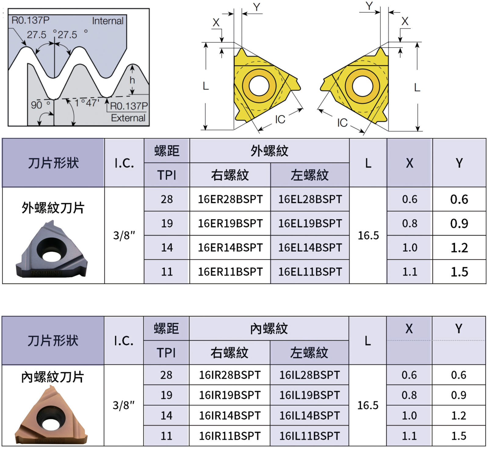 為了使您有良好的加工品質,在選購和使用時請考慮以下幾點: 1、根據加工內、外螺紋、螺紋旋向及工件螺距、牙數/英吋,按我們提供的“切削外(內)螺紋用刀片”表選擇 合適型號的螺紋刀片(樣本),并請與我們的銷售人員商量,根據被加工零件的材料,選擇最適合您使用的刀片牌號。 2、根據您所采用的車床的型號,加工方式及已選用的刀片型號來選擇適當的刀桿型號。