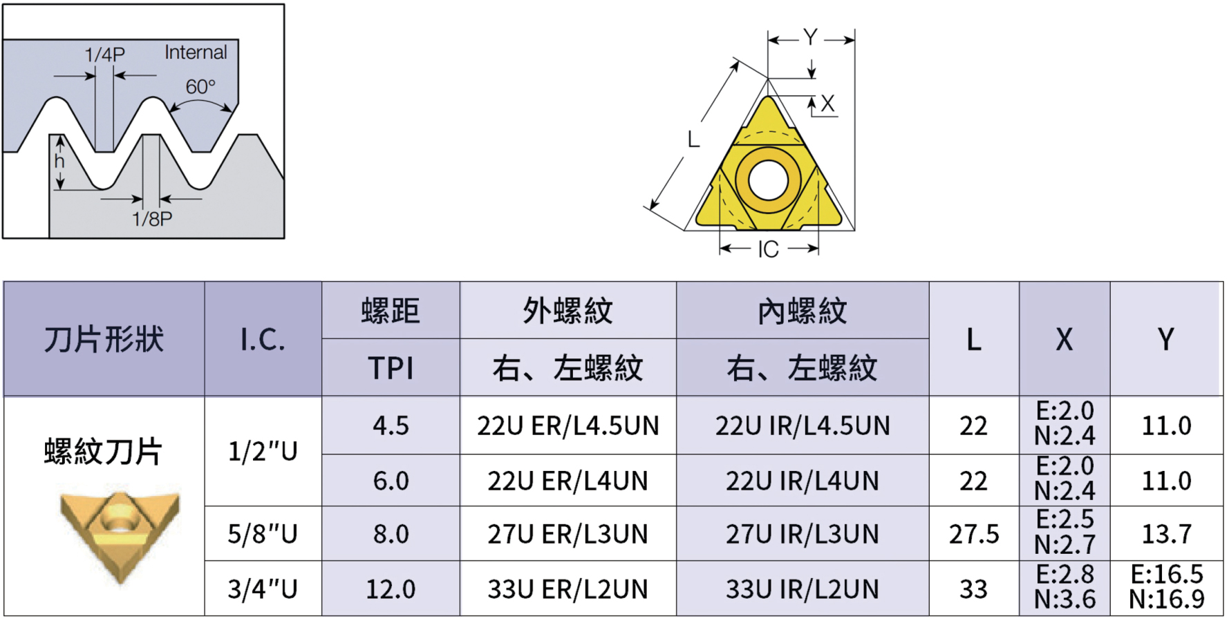 為了使您有良好的加工品質(zhì),在選購和使用時請考慮以下幾點: 1、根據(jù)加工內(nèi)、外螺紋、螺紋旋向及工件螺距、牙數(shù)/英吋,按我們提供的“切削外(內(nèi))螺紋用刀片”表選擇 合適型號的螺紋刀片(樣本),并請與我們的銷售人員商量,根據(jù)被加工零件的材料,選擇最適合您使用的刀片牌號。 2、根據(jù)您所采用的車床的型號,加工方式及已選用的刀片型號來選擇適當?shù)牡稐U型號。