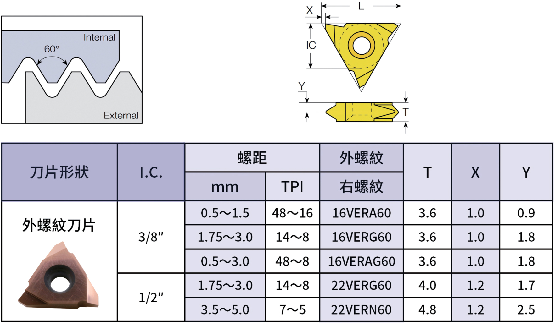 為了使您有良好的加工品質,在選購和使用時請考慮以下幾點: 1、根據加工內、外螺紋、螺紋旋向及工件螺距、牙數/英吋,按我們提供的“切削外(內)螺紋用刀片”表選擇 合適型號的螺紋刀片(樣本),并請與我們的銷售人員商量,根據被加工零件的材料,選擇最適合您使用的刀片牌號。 2、根據您所采用的車床的型號,加工方式及已選用的刀片型號來選擇適當的刀桿型號。